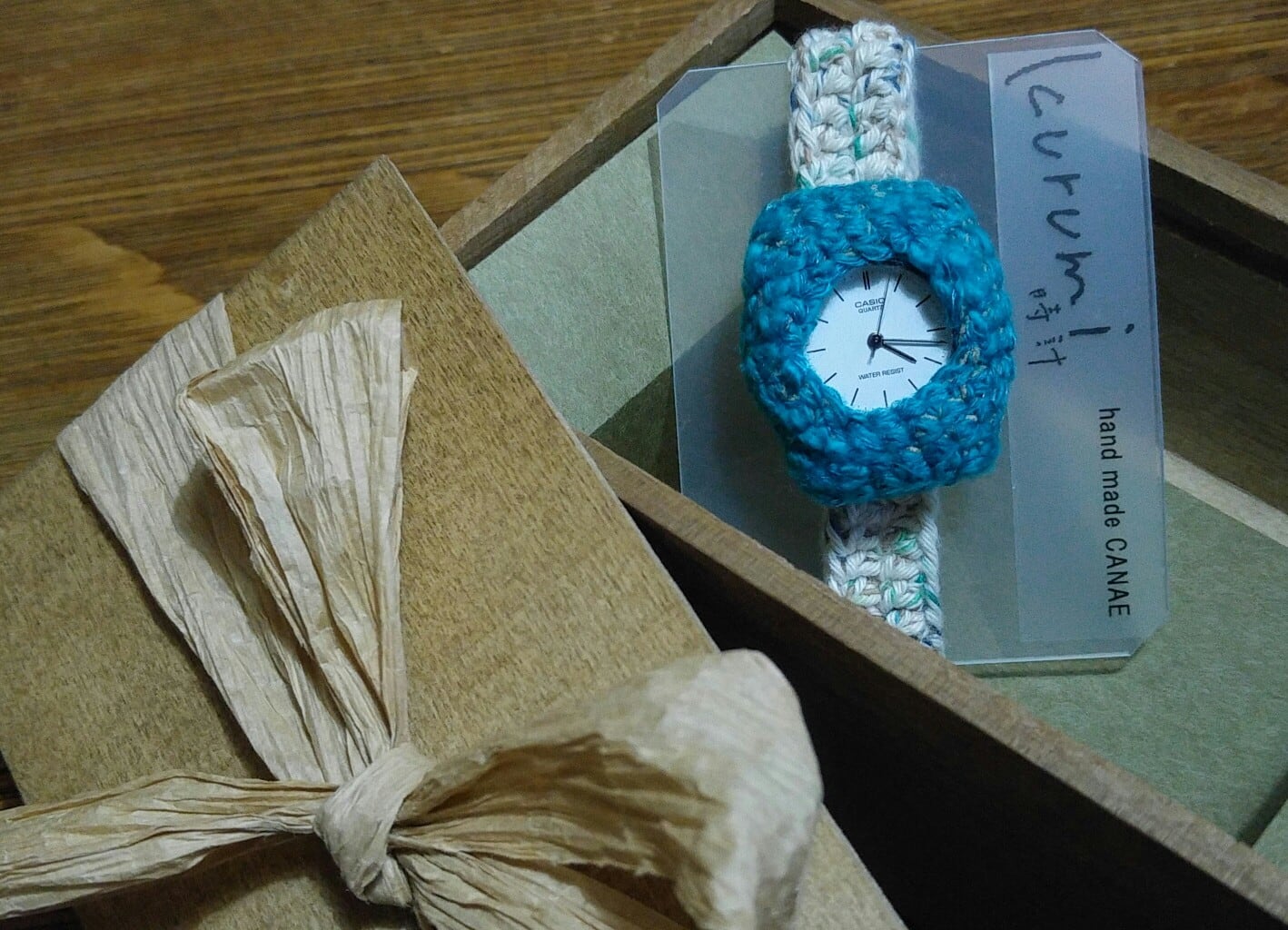 伸縮性のあるニットのベルトに時計をくるんでいます。
