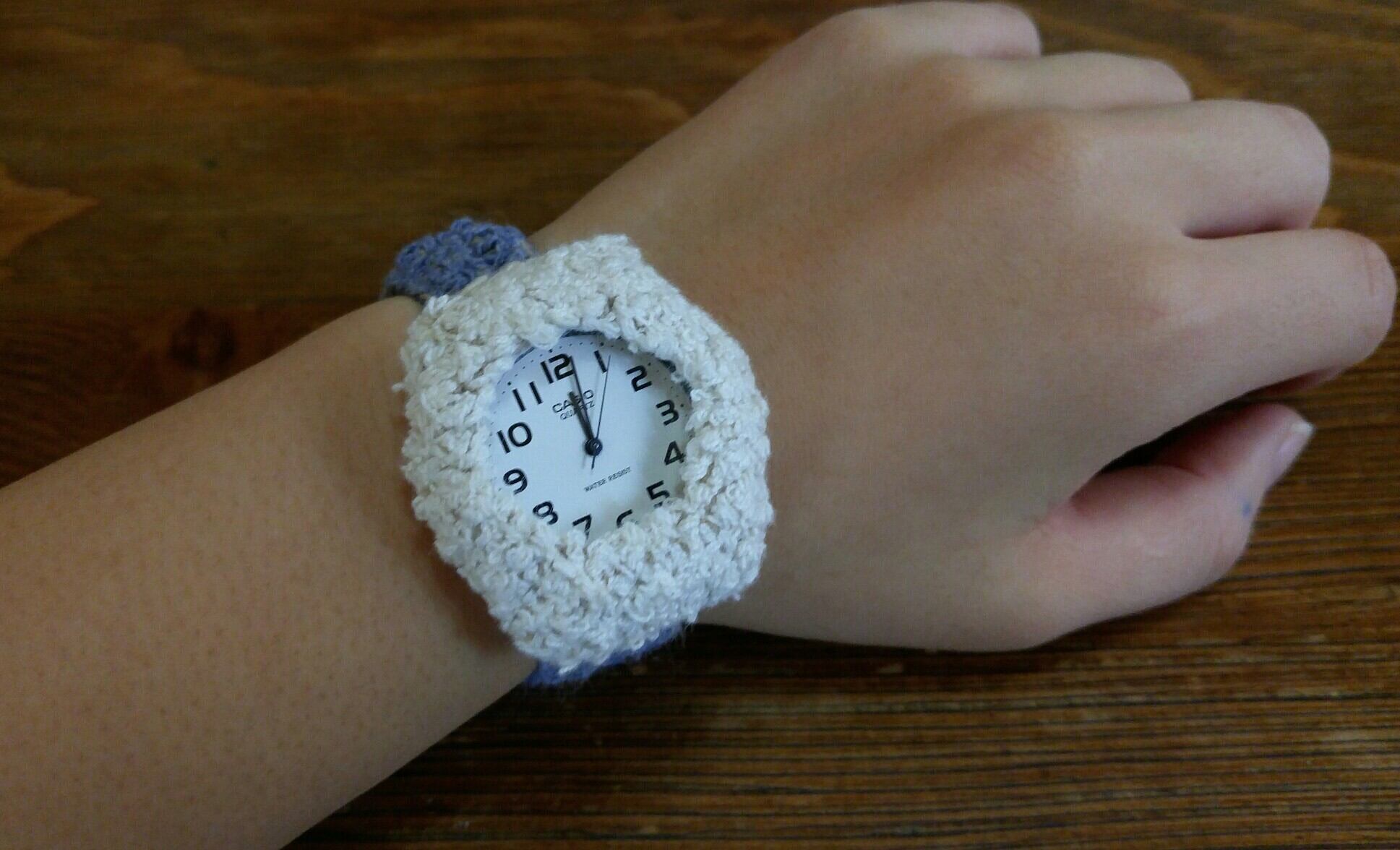 伸縮性のあるニットのベルトに時計をくるんでいます。