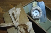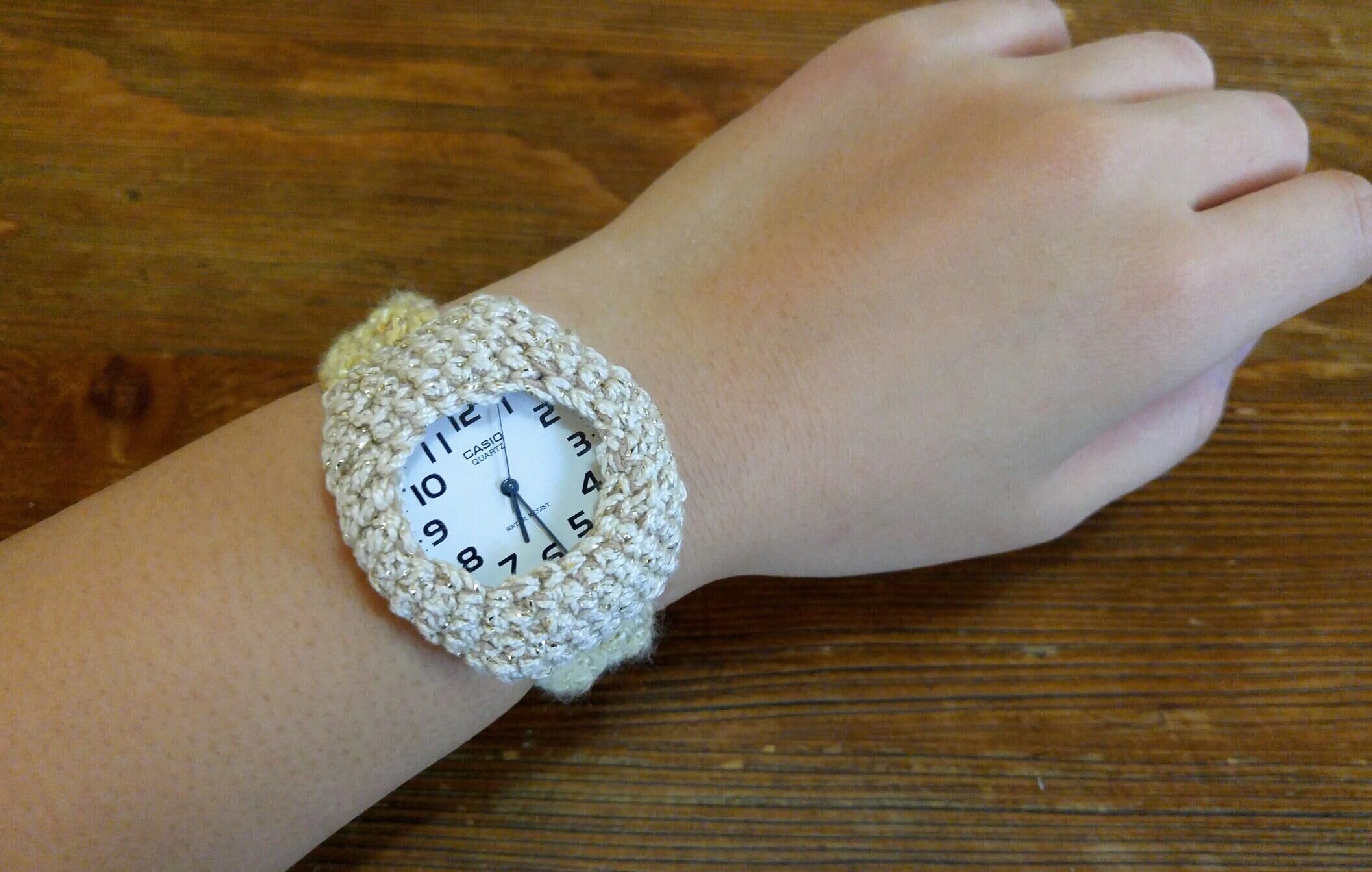 伸縮性のあるニットのベルトに時計をくるんでいます。