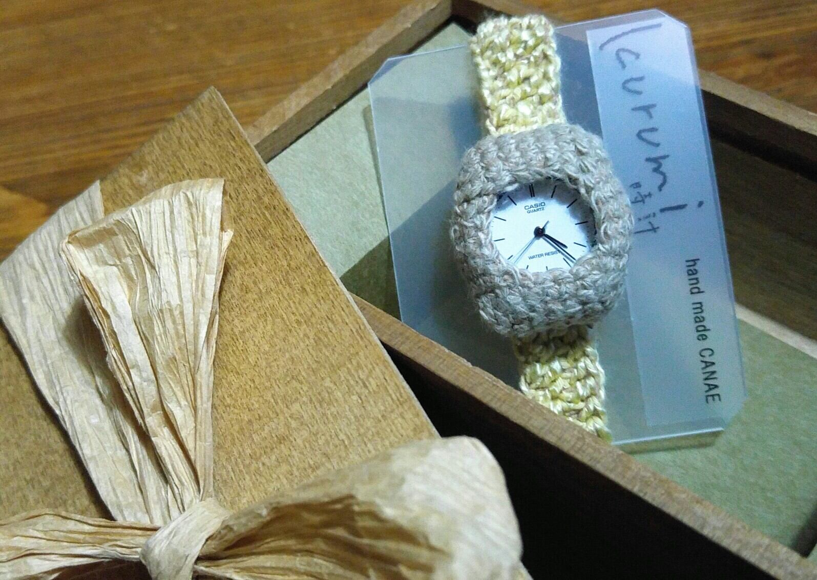 伸縮性のあるニットのベルトに時計をくるんでいます。