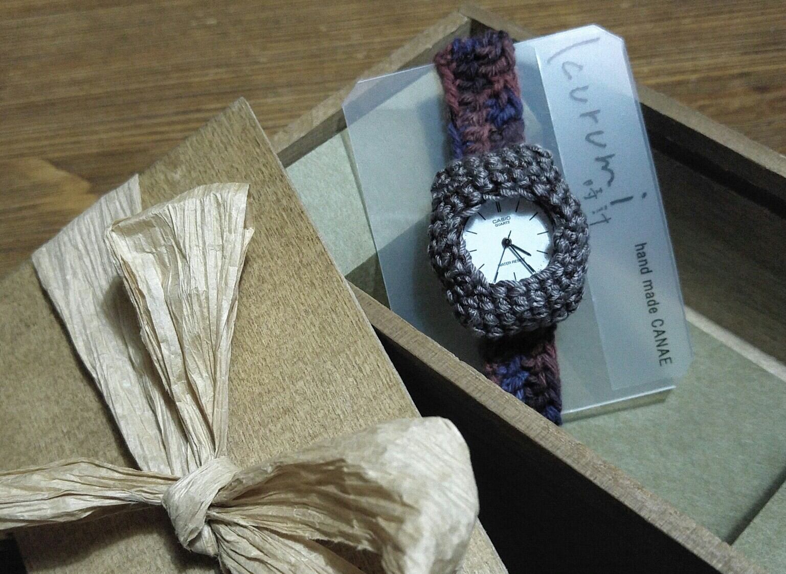 伸縮性のあるニットのベルトに時計をくるんでいます。