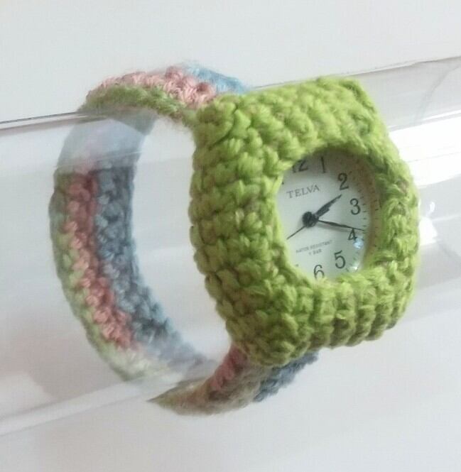 伸縮性のあるニットのベルトに時計をくるんでいます。